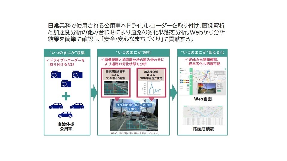 日常業務で使用される公用車へドライブレコーダーを取り付け、画像解析と加速度分析の組み合わせにより道路の劣化状態を分析。Webから分析結果を簡単に確認し、「安全・安心なまちづくり」に貢献する。